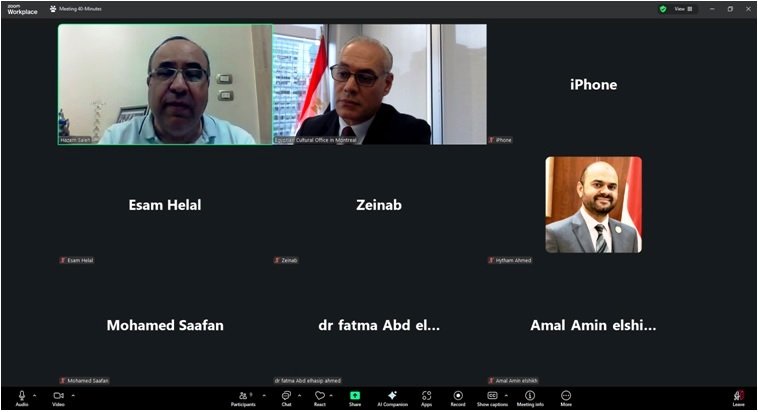 Professor Dr. Ahmed Gaber, Cultural Counselor and Director of the Educational Mission in Canada, met today with Professor Dr. Hazem Salah, Vice President of Menoufia University for Postgraduate Studies and Research and former Egyptian Cultural Counselor in Canada. The meeting was attended by the Deans and Vice Deans of the Faculties of Pharmacy, Engineering, and Nursing at Menoufia University, and focused on exploring ways to strengthen academic and scientific cooperation between Menoufia University and Canadian universities. Discussions also addressed opportunities for exchanging expertise and developing joint programs in the fields of education, scientific research, and training, with the aim of promoting academic excellence and enhancing research capacity.