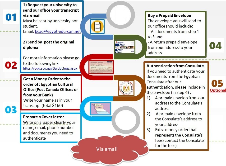 • Contact your university to send your transcript directly to the Egyptian Cultural Office via email.
